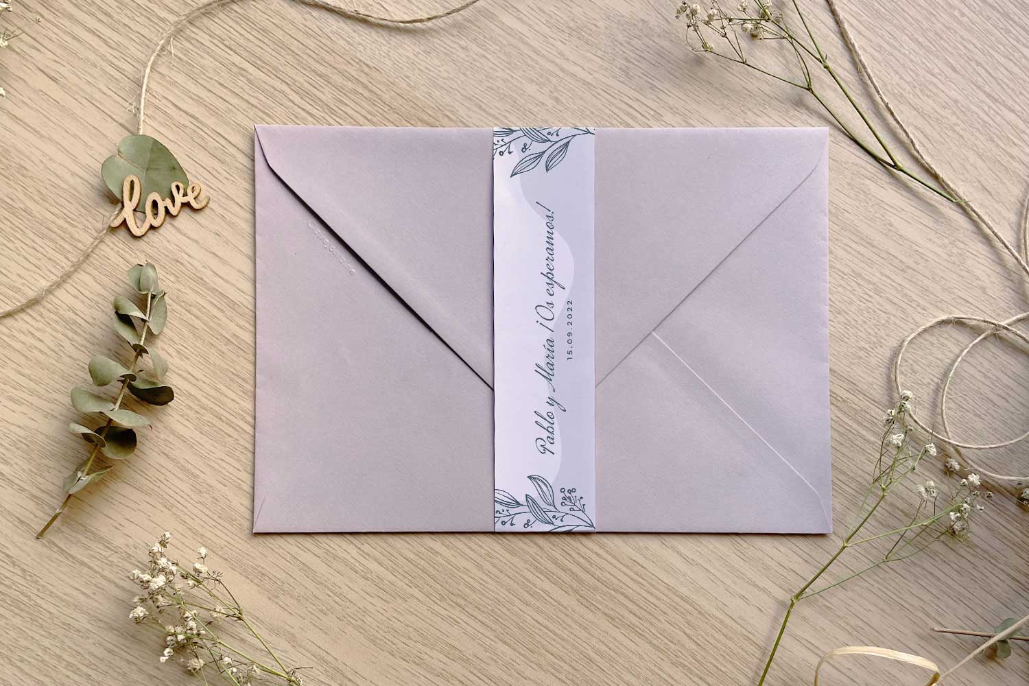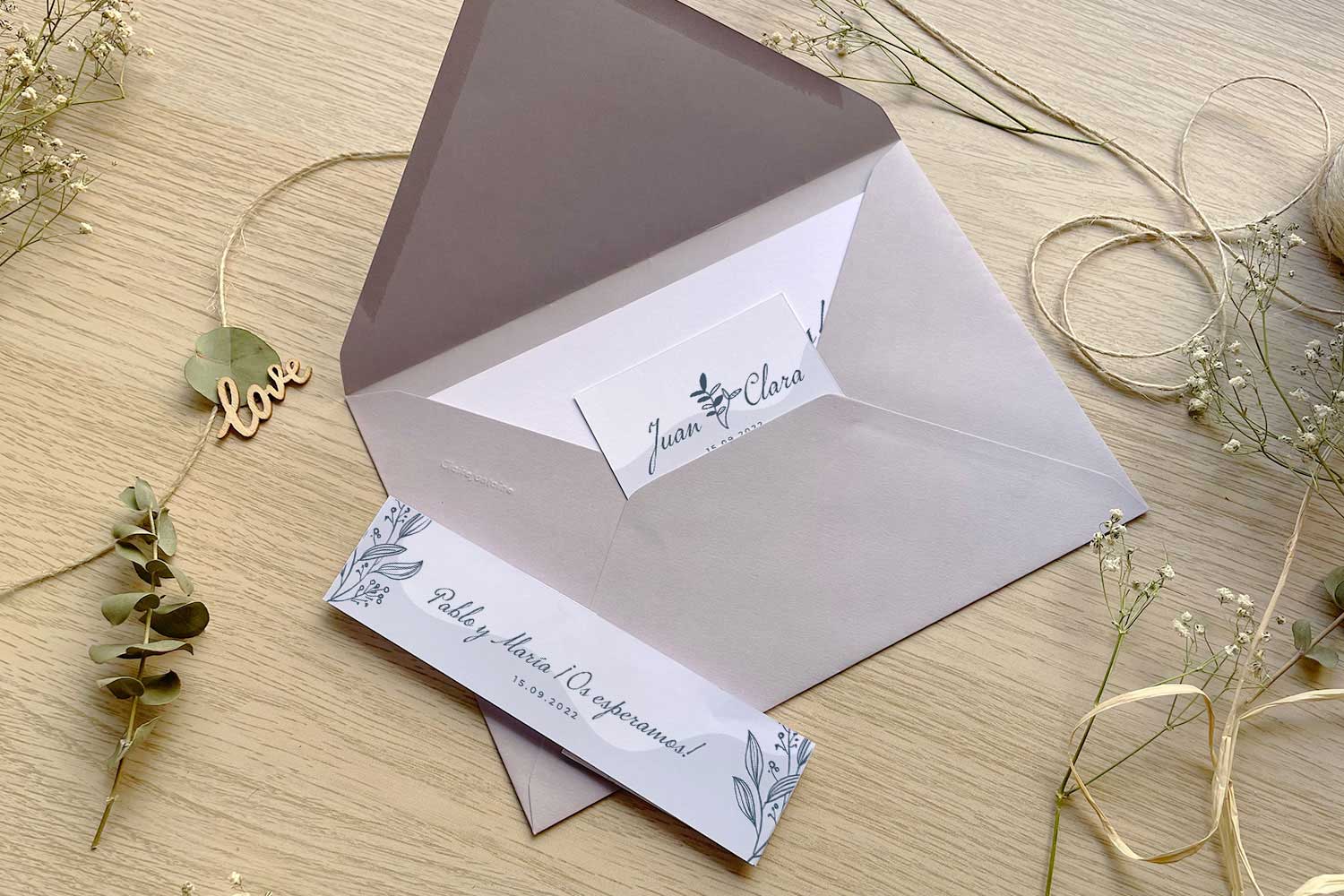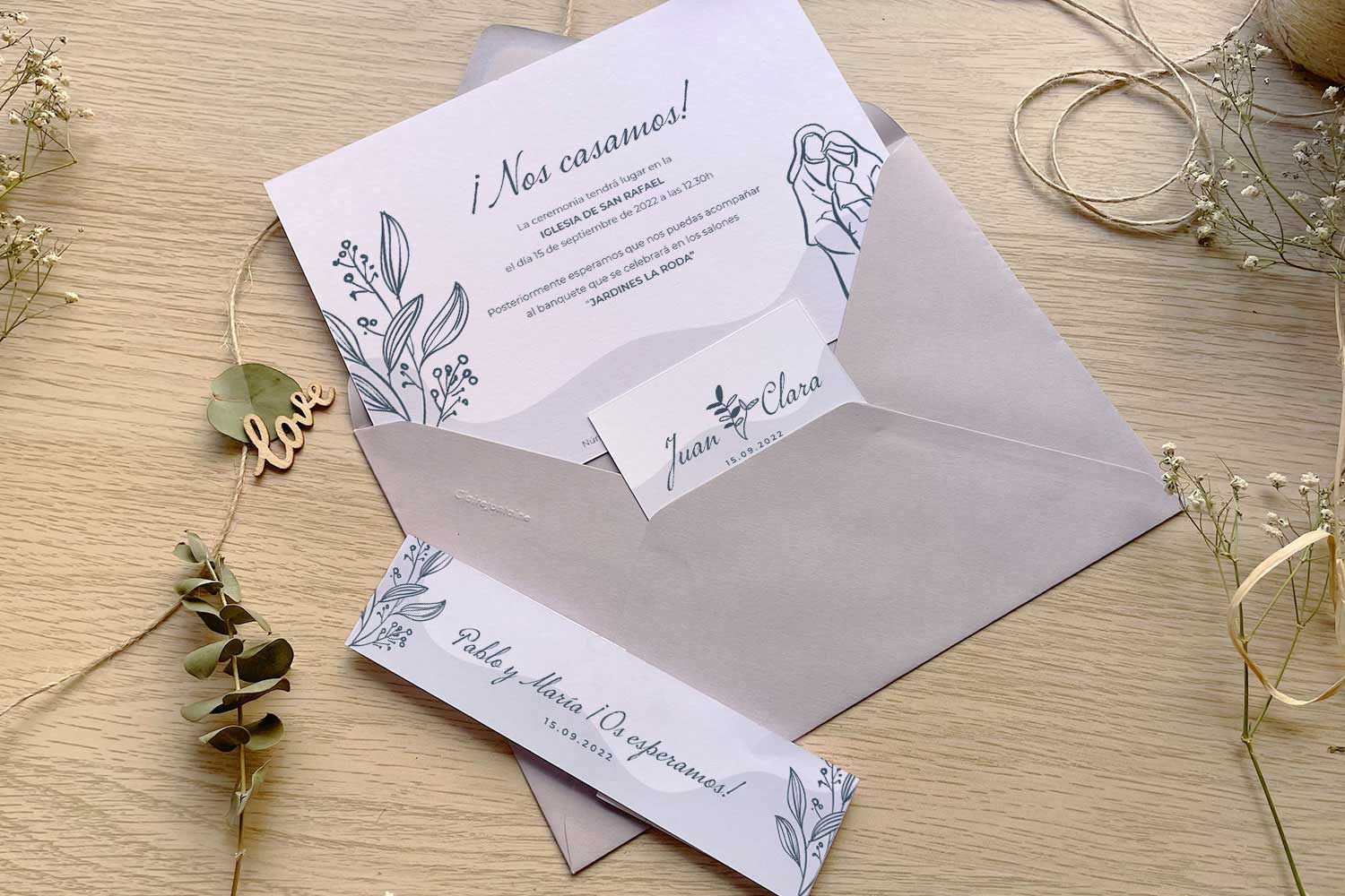 Las invitaciones de siempre con un diseño para vosotros. Estas invitaciones están hechas a partir de una lámina A5 con sobre. Junto con vuestras invitaciones de boda tendréis una pequeña tarjeta con la información básica de la boda (día, lugar, hora, nº de cuenta…). Como cierre utilizaremos un fajín al que añadiremos el nombre del invitado. Estas invitaciones incluyen: