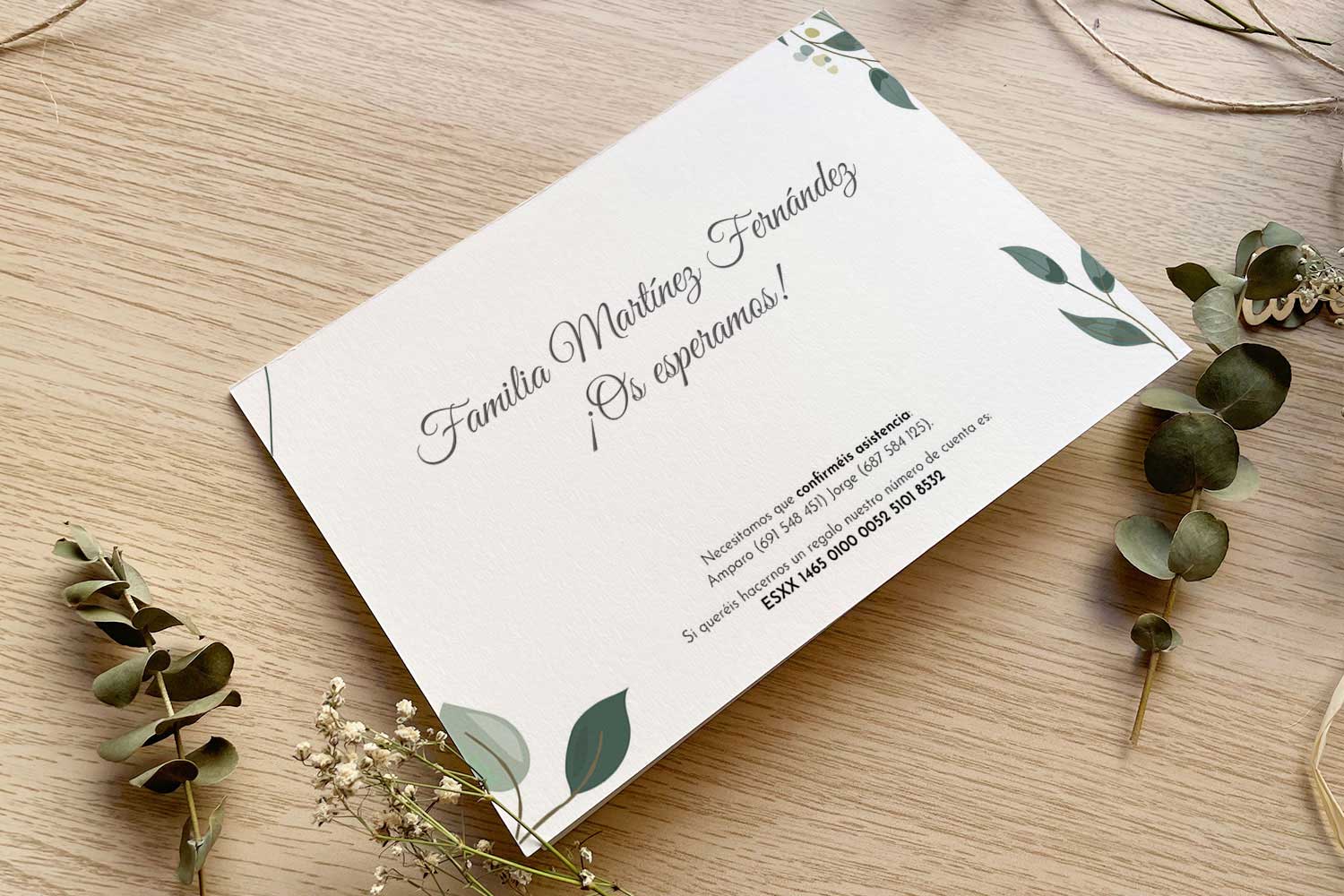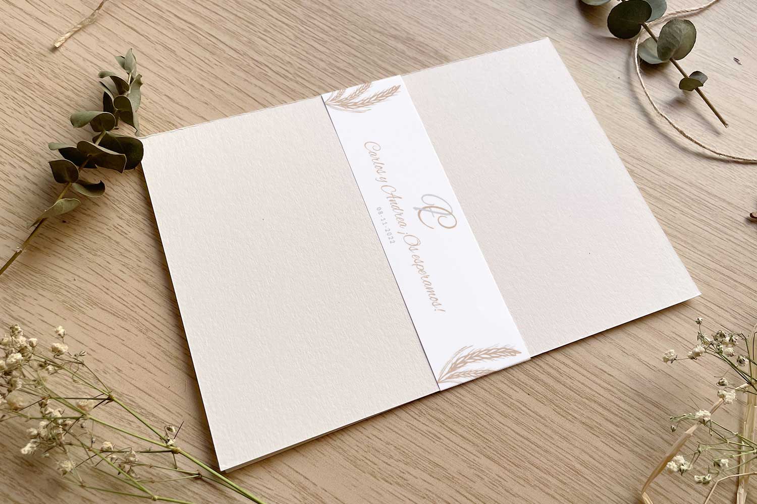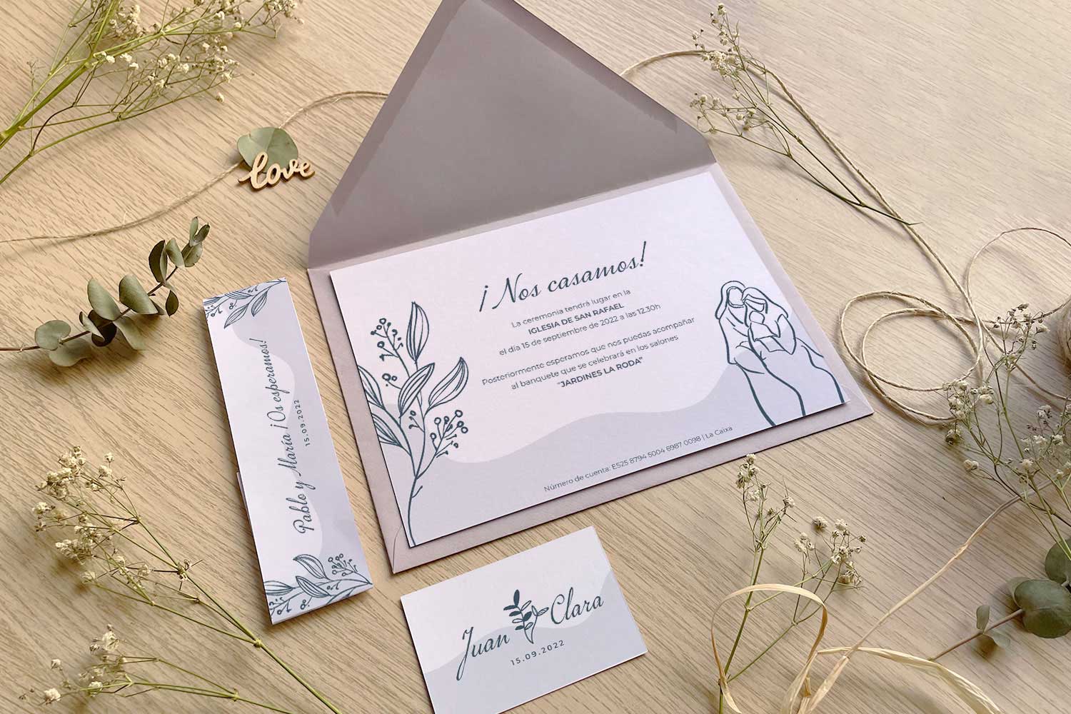 Las invitaciones de siempre con un diseño para vosotros. Estas invitaciones están hechas a partir de una lámina A5 con sobre. Junto con vuestras invitaciones de boda tendréis una pequeña tarjeta con la información básica de la boda (día, lugar, hora, nº de cuenta…). Como cierre utilizaremos un fajín al que añadiremos el nombre del invitado. Estas invitaciones incluyen: