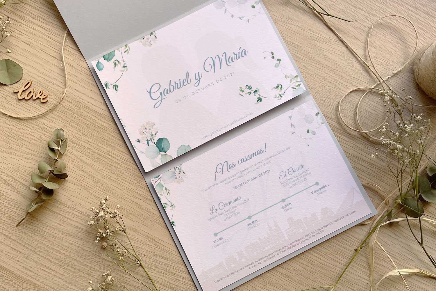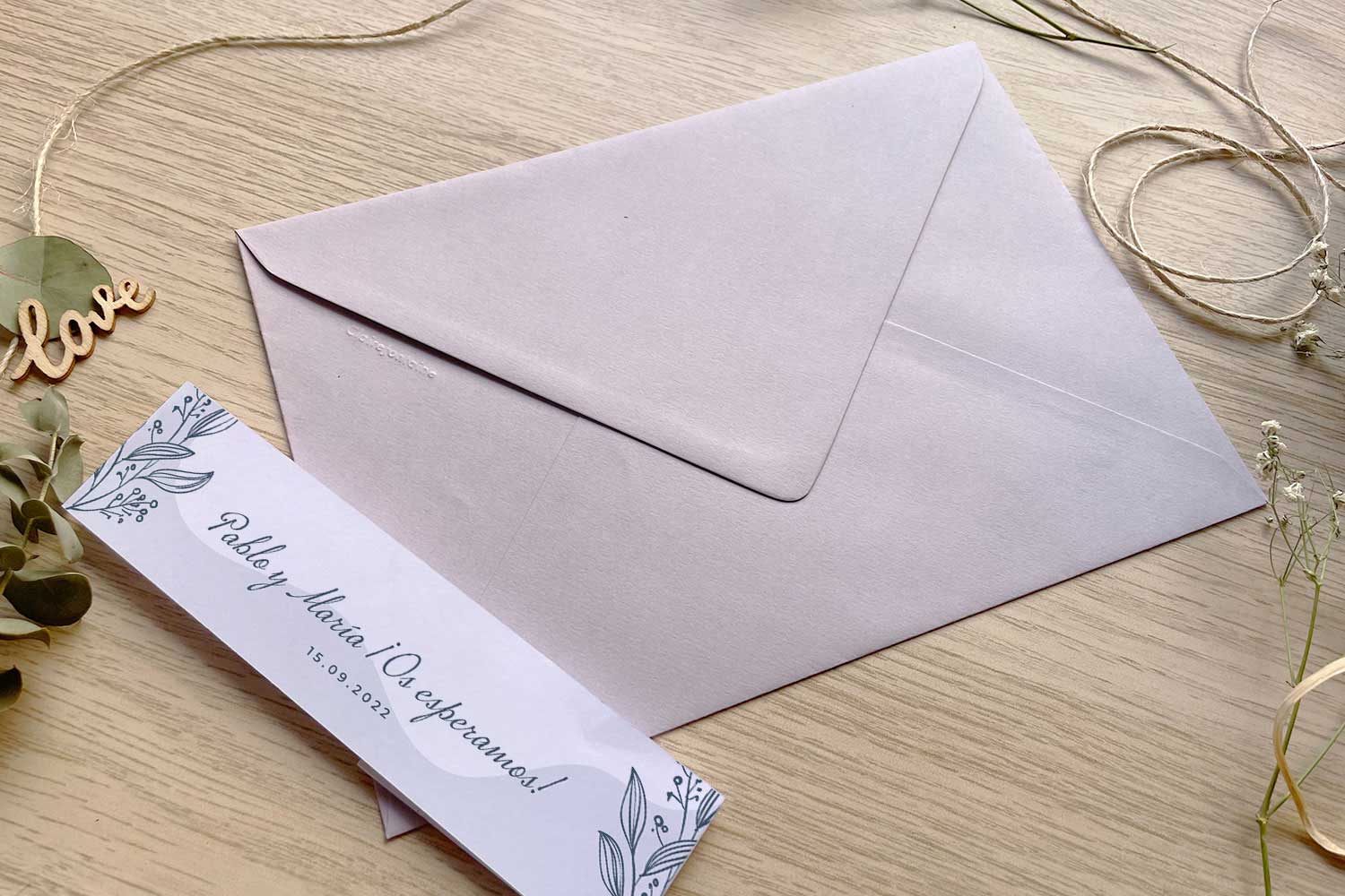 Una opción diferente a las invitaciones clásicas. Hemos diseñado unas invitaciones de boda a partir de una lámina A4 plegada. Estas invitaciones incluyen el nombre del invitado «manuscrito» en el sobre por un plotter que simula la escritura de una persona, por lo que no tendréis que preocuparos de añadir etiquetas ni cuerdecitas con el nombre del invitado. Incluye: