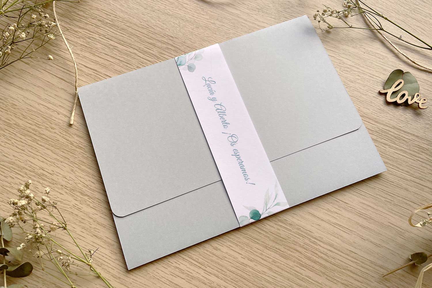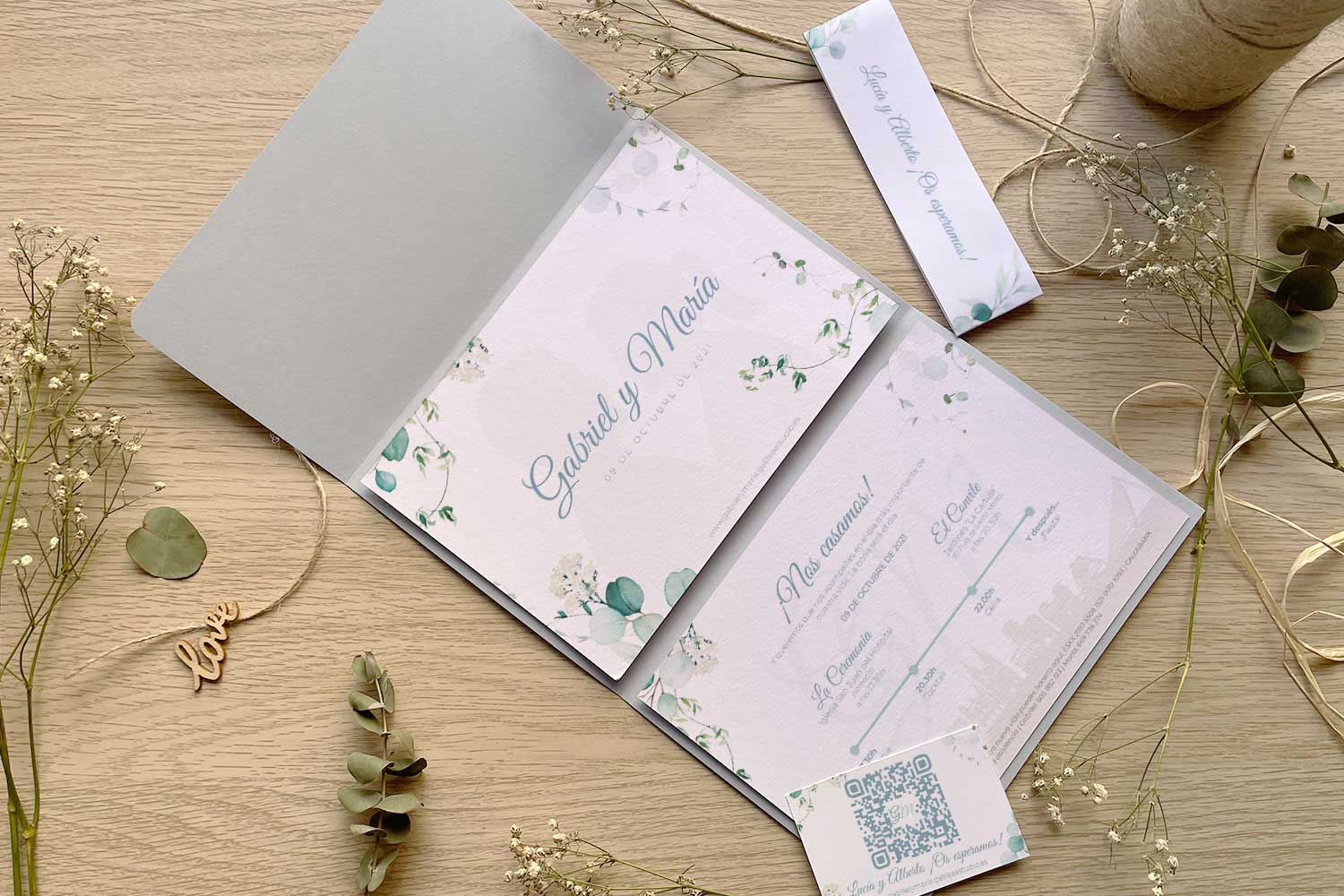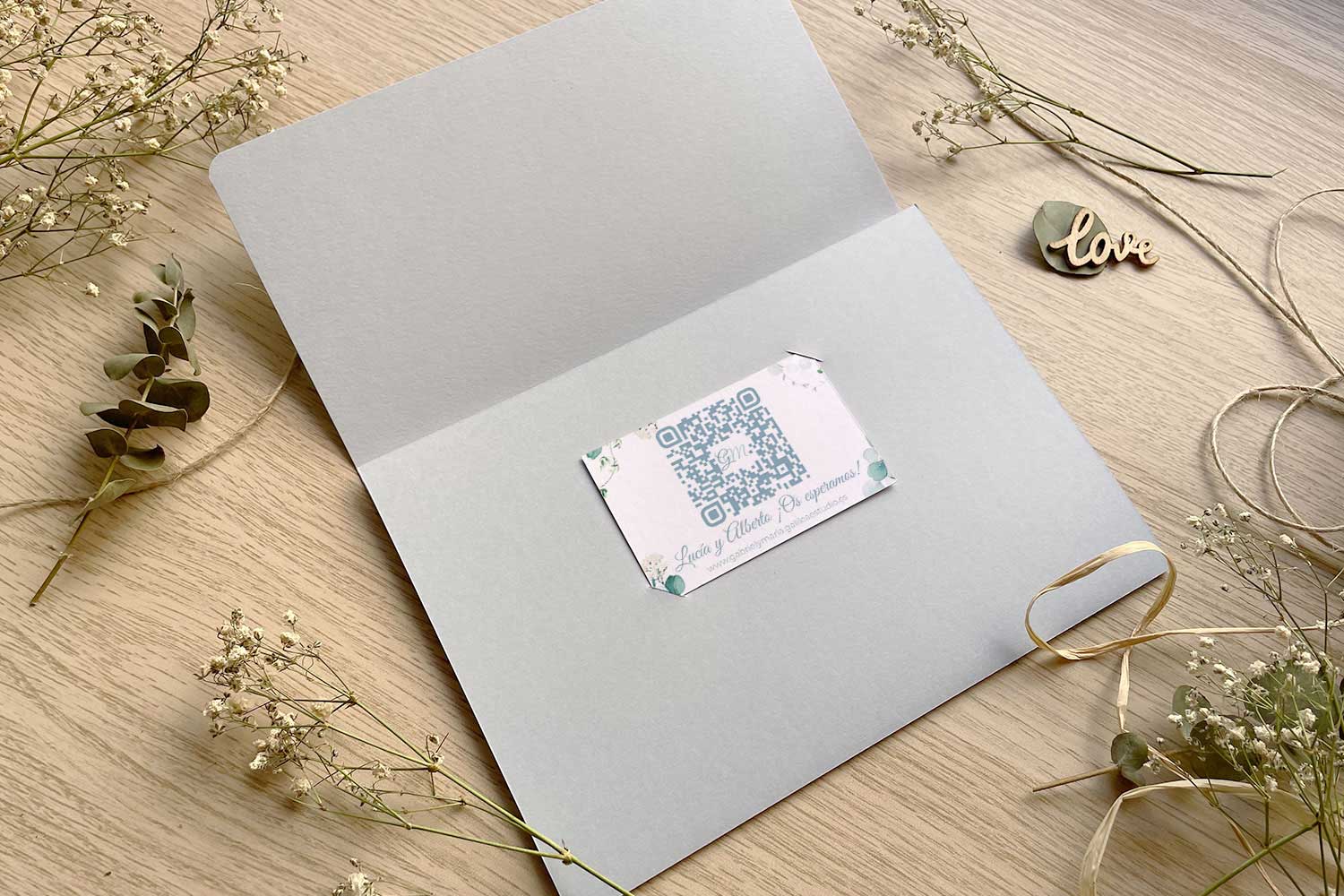 Nos gusta tanto este modelo de invitaciones que le hemos puesto nuestro propio nombre. Es la opción más completa y original. La invitación consta de dos láminas A5 ensambladas en un sobre diseñado por nosotros junto con la tarjeta de información con el QR. Este QR será diferente en cada invitación y se accederá a vuestra web personalizada para cada invitado. La invitación se cierra con un fajín con el nombre de los invitados. Incluyen: